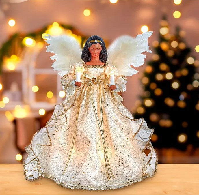 12" 10 LED Marfil Oro Ángel Árbol Topper Afroamericano