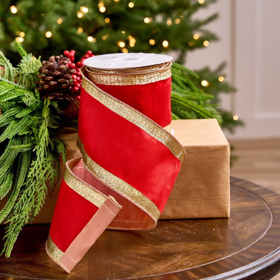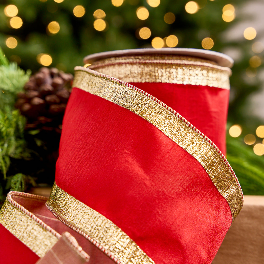 4" X 10YD Red Dupion Ribbon With Gold Sheer Back & Gold Crochet Trim