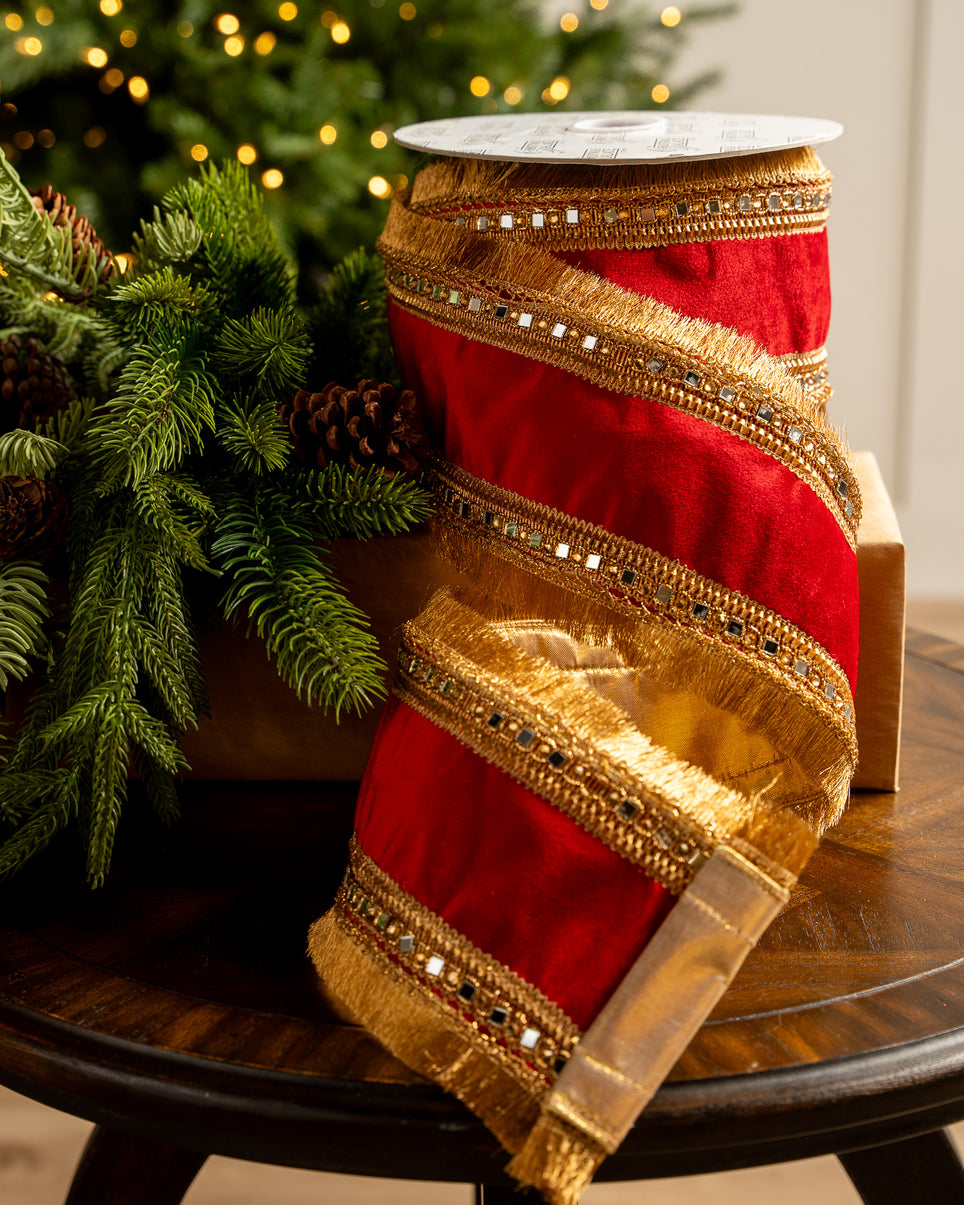 Cinta de terciopelo rojo de 4" x 10 yardas con espejo en el borde