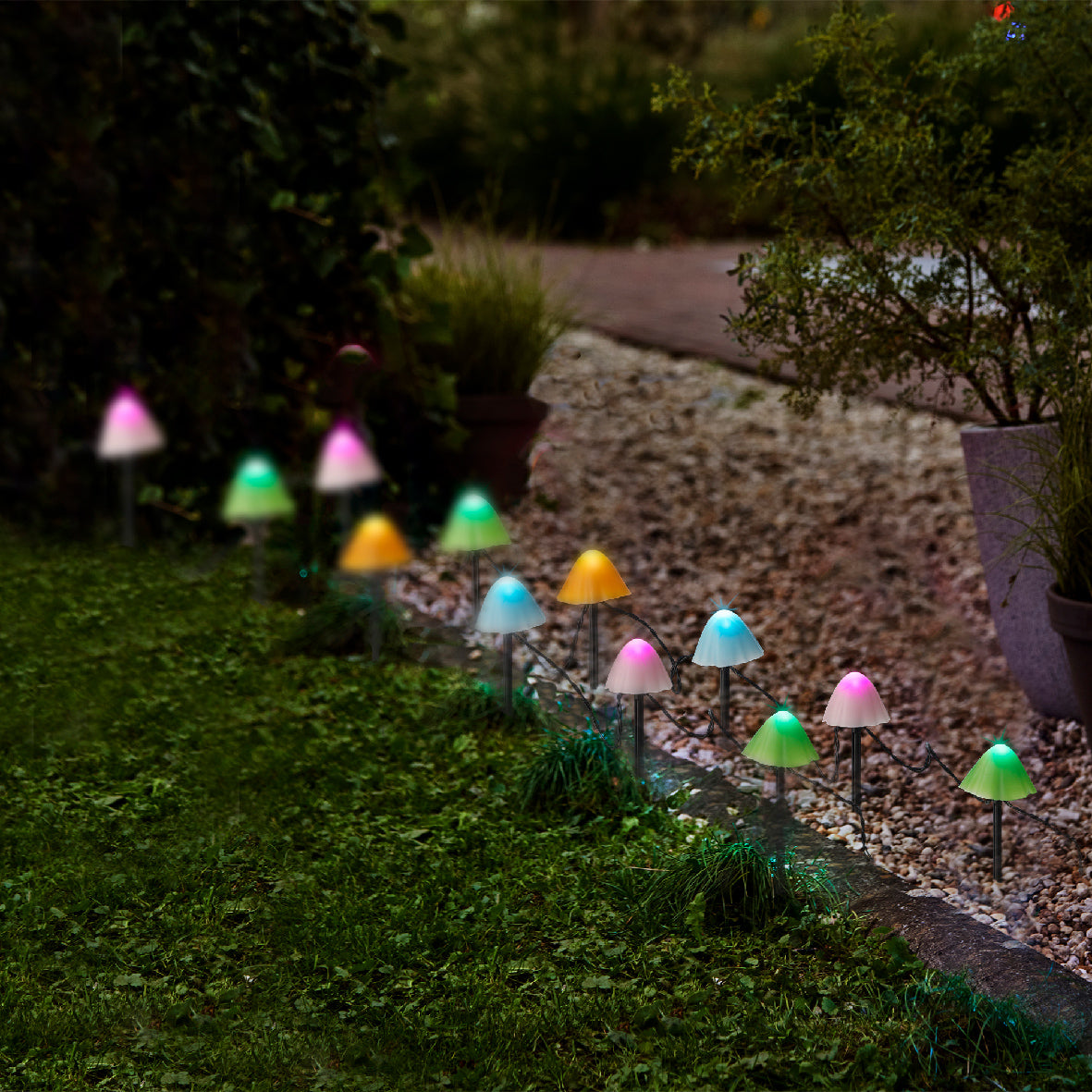 8" 20 LED Multi Mushroom Stakes With Black Wire