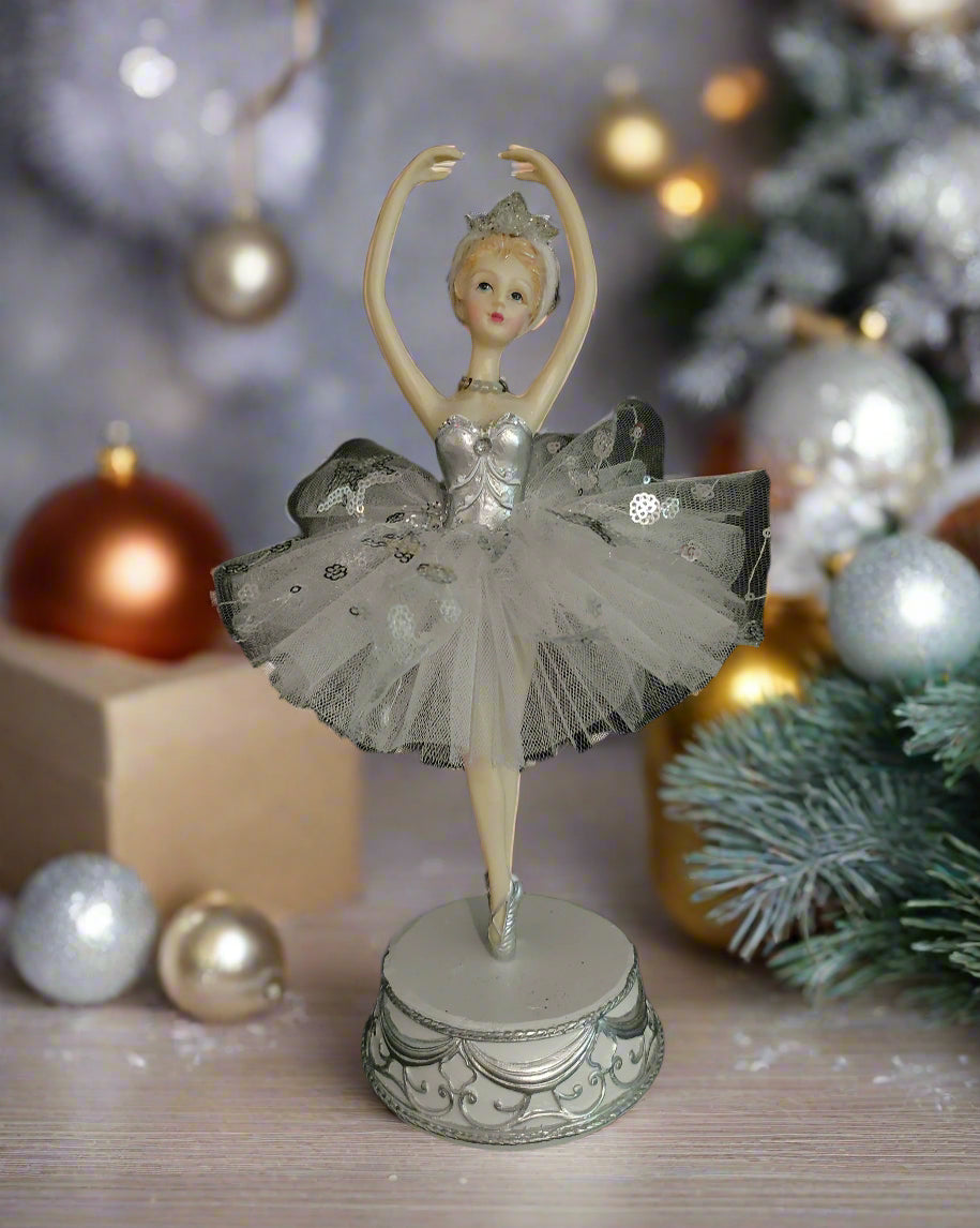 This stunning music box features a beautiful ballerina dressed in a silver corset and white tutu, adorned with silver sequins that sparkle like diamonds. Standing on a elegant white music box stand with silver accents, she is poised to dance to the sweet melody of a traditional Christmas carol. As the music plays, the ballerina's delicate feet move in perfect rhythm, casting a spell of wonder and enchantment over all who behold her.