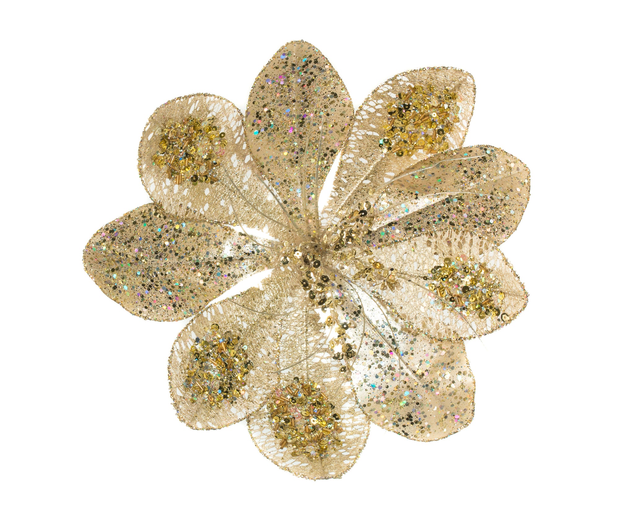 As the light catches this beautiful pick, the sequins seem to come alive, reflecting an array of colors and dancing beautifully across the surface. The effect is mesmerizing, as if the flower itself is radiating a warm, festive glow. This poinsettia pick is the perfect way to add some extra glamour to your holiday decorations.