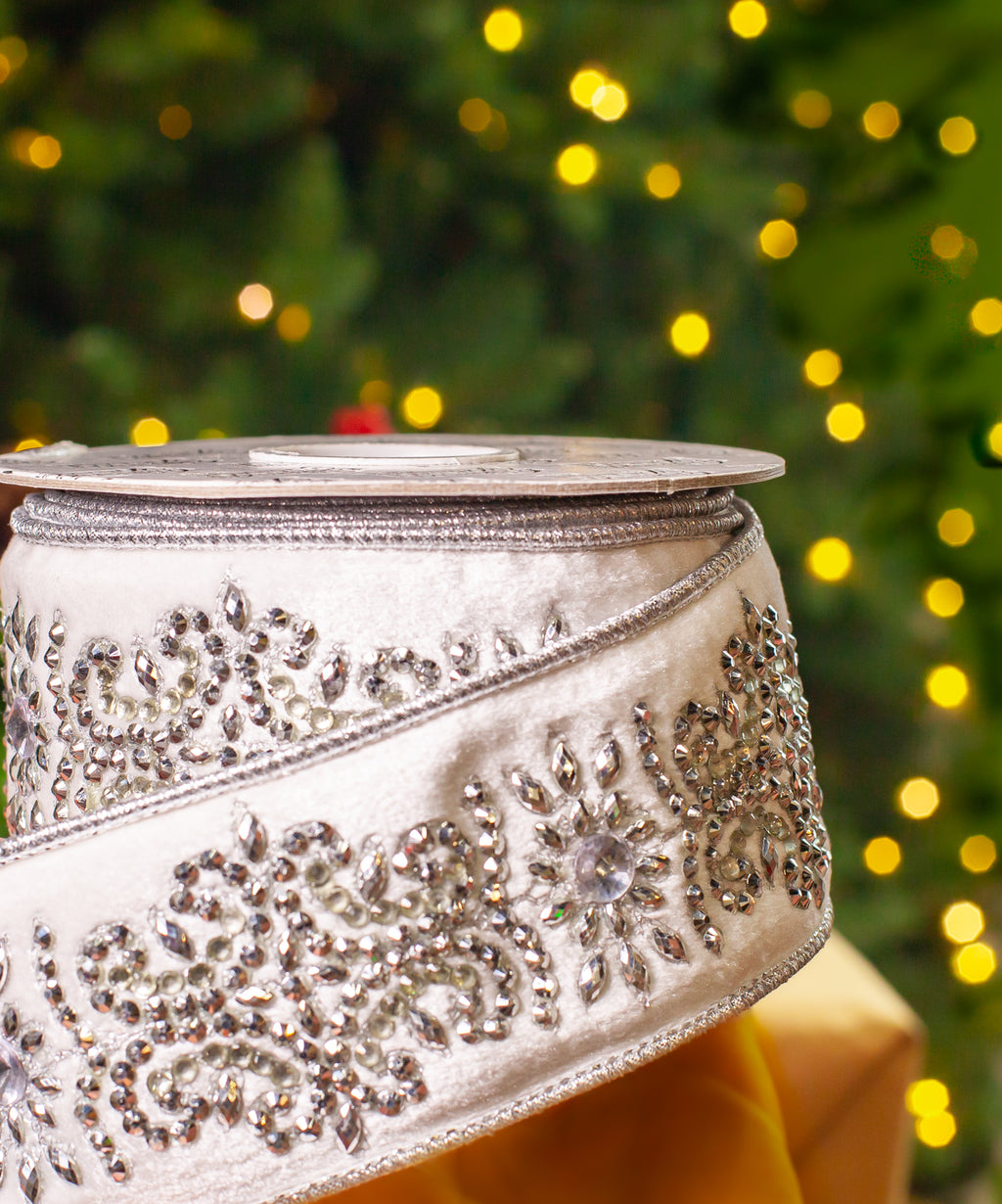 2.5" X 5YD White Velvet Jeweled Ribbon With Silver Back