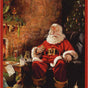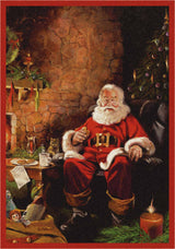 Cozy up your holiday decor with this enchanting Christmas rug, bathed in warm red tones that radiate festive charm. A rustic stone wall with a beautifully adorned mantle sets the scene, draped in lush greenery. To one side, a twinkling Christmas tree peeks in, decorated with colorful ornaments, while Santa himself lounges comfortably in front, indulging in delicious cookies and a steaming cup of hot cocoa. Adding to the magic, a sweet kitten peeks out from behind him, bringing an extra touch of warmth and charm to this heartwarming design.