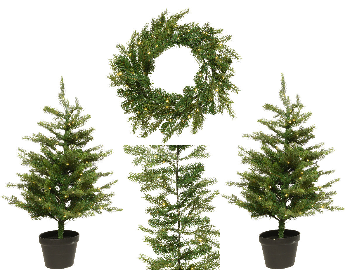 Grandis Set 2 Pre-Lit Trees, Wreath, & Garland Battery Operated