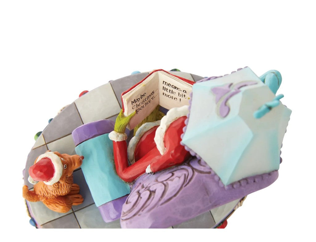 This Jim Shore creation features The Grinch reading in a large rosemale blue and purple chair. With a light-up lamp, Grinch reads his Dr. Seuss book dressed as Santa. His loyal dog, Max, sits by his side. Enjoy Christmas with this classic character!