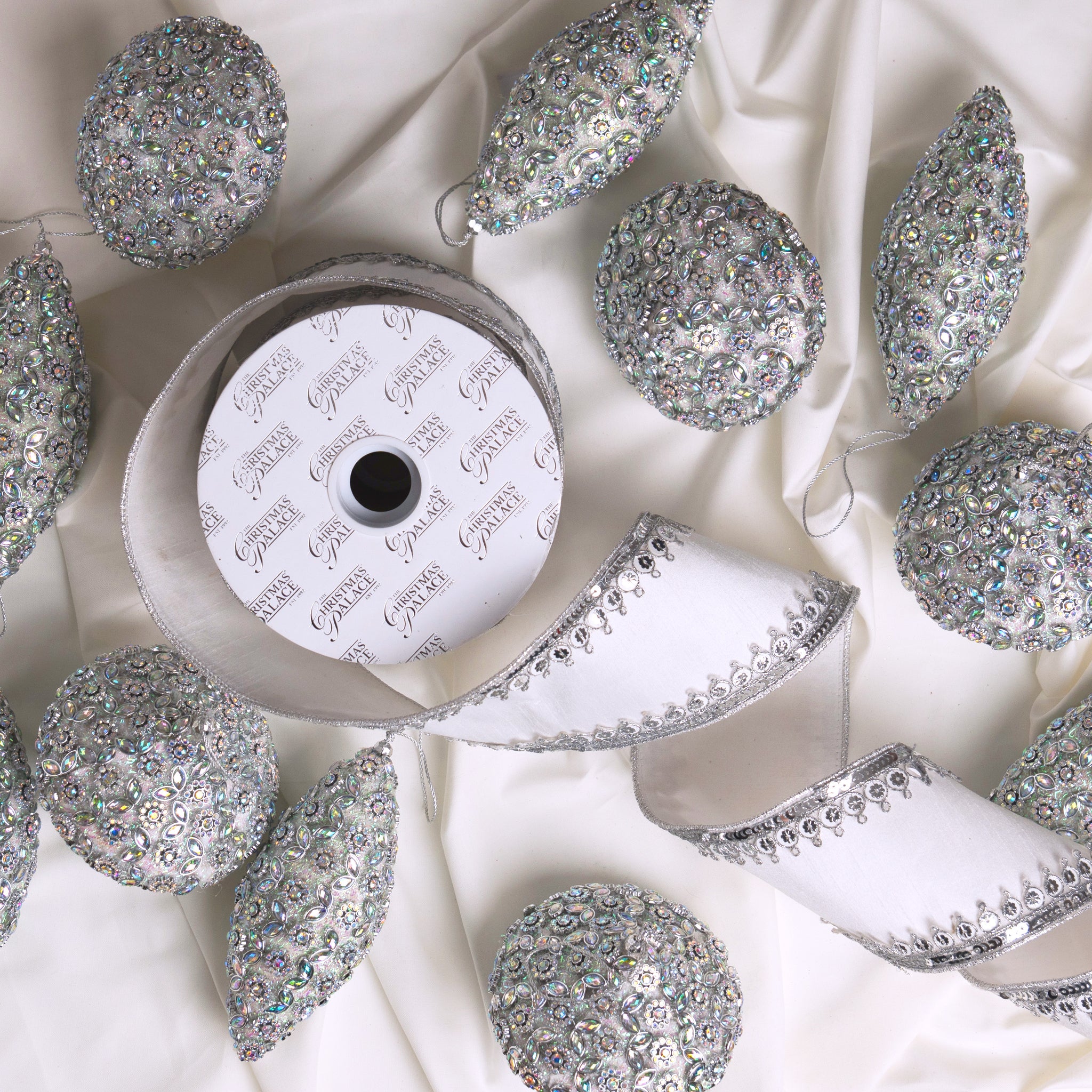 - 1 Roll of Ribbon: A luxurious white ribbon trimmed with silver sparkle, perfectly designed to complement the ornament set and elevate trees, garlands, or wreaths with a sophisticated finish.