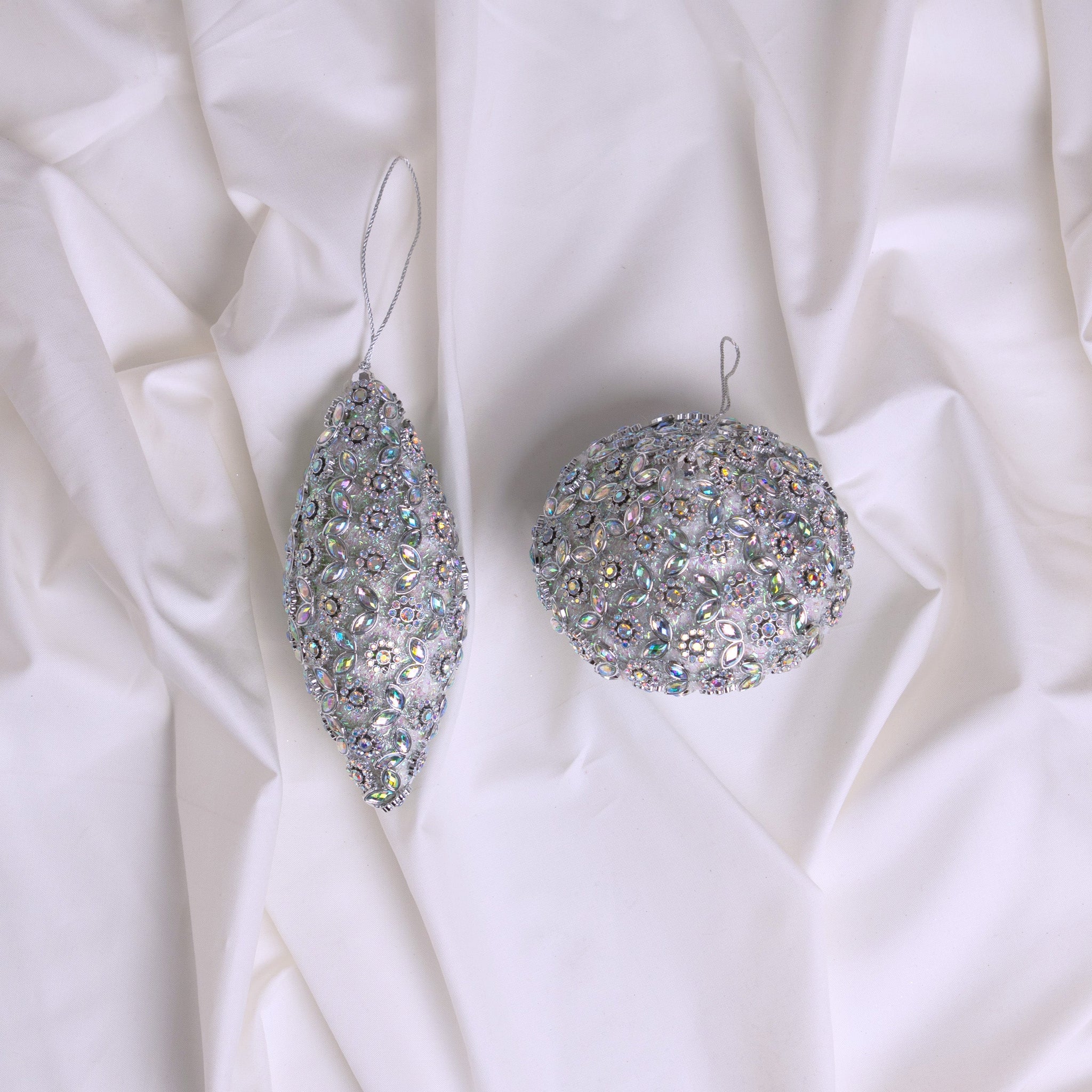 - 12 Ornaments (6 of each style): Two exquisite designs—round and elongated teardrop—each richly embellished with silver detailing and dazzling crystal accents for a cohesive, radiant presentation.